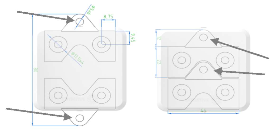 Figure 2: Adhesive plates for mounting with screws. Use the holes pointed out for adjacent or hidden screw installation.
